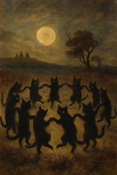 De verhalen zeggen dat het geen gewone katten zijn. In de duisternis nemen heksen hun gedaante aan, dansen ze poot aan poot en zingen met een stem die tegelijk lokt en beangstigt.